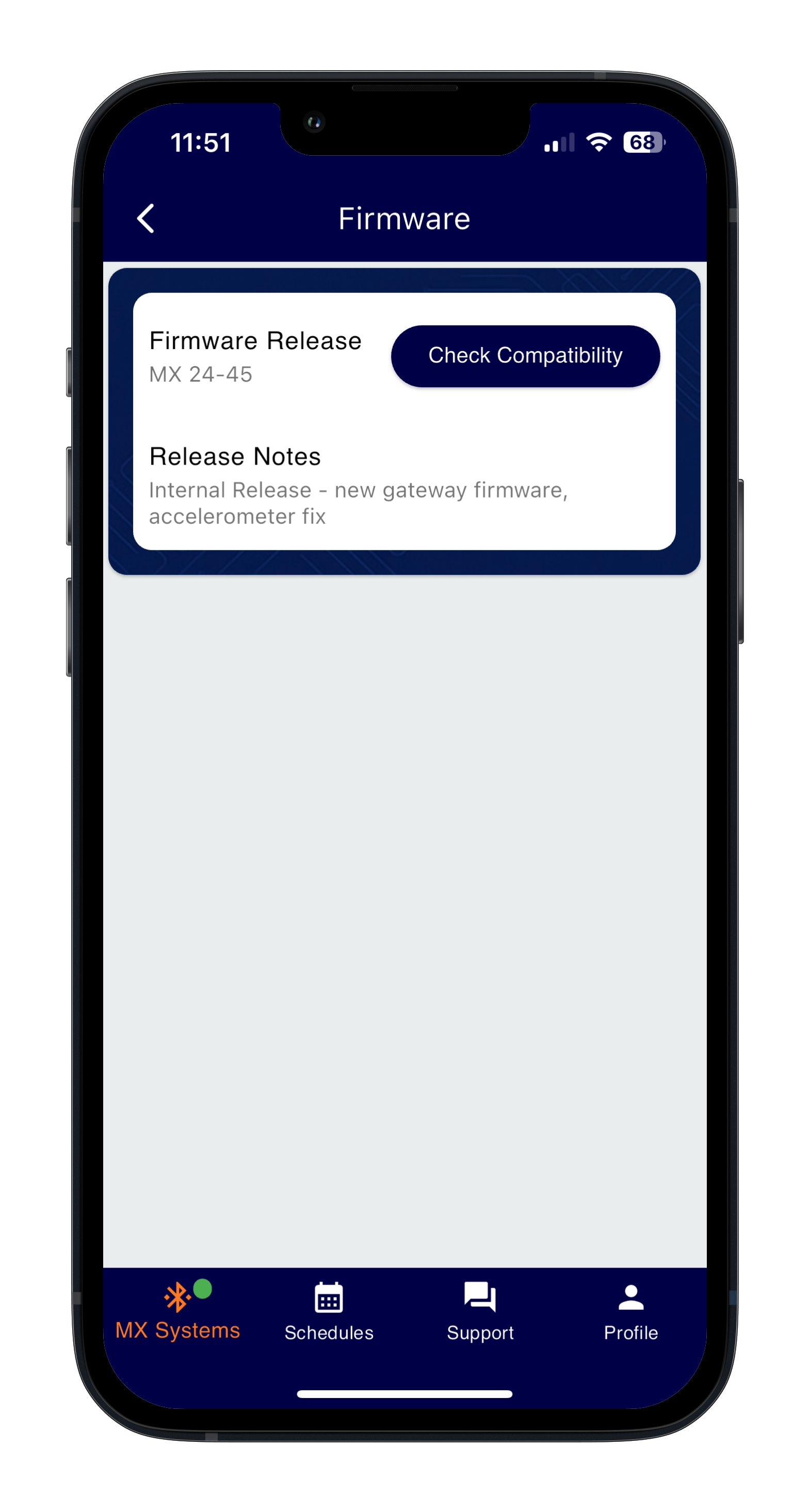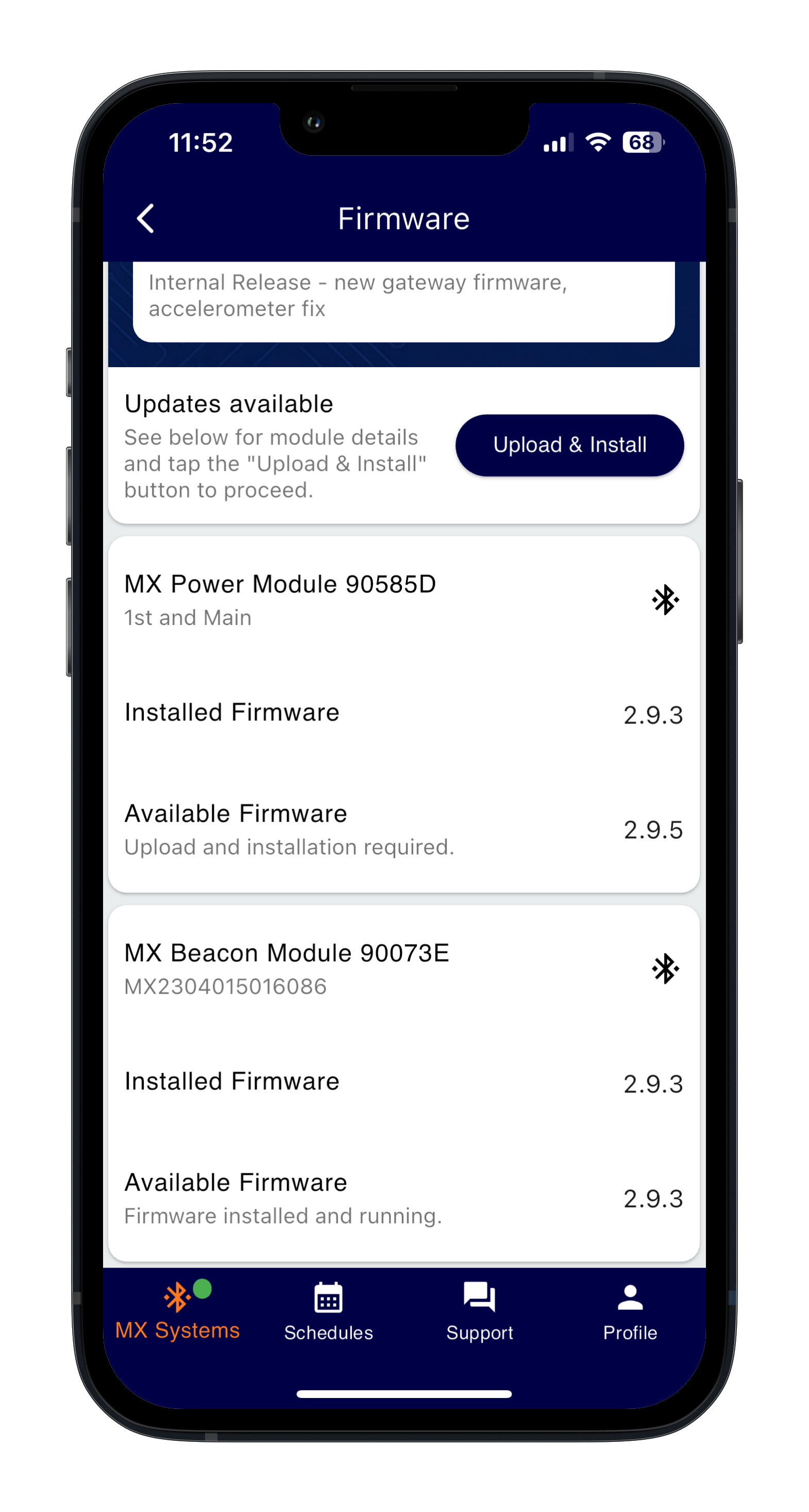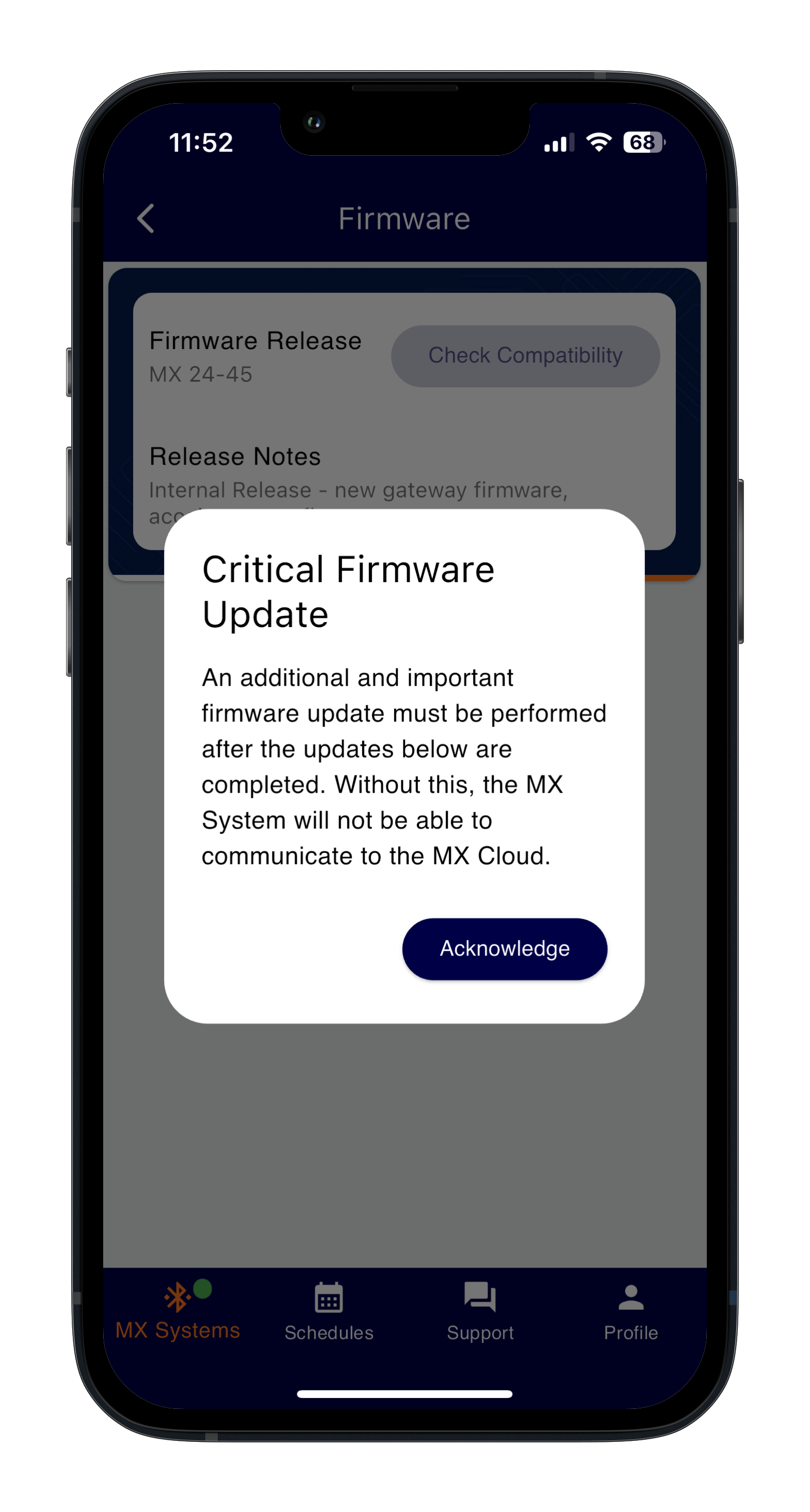 If your system has been identified as requiring this firmware update, or your system no longer reports into MX Cloud, follow the instructions below for on-site firmware updating via MX Field App: