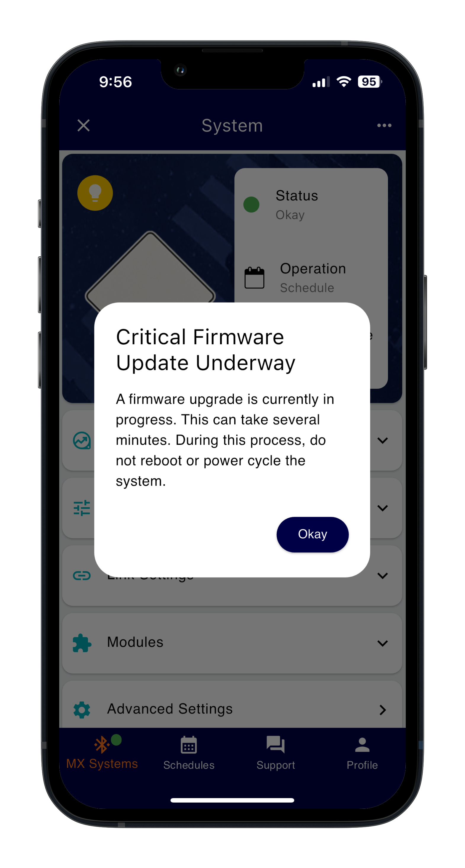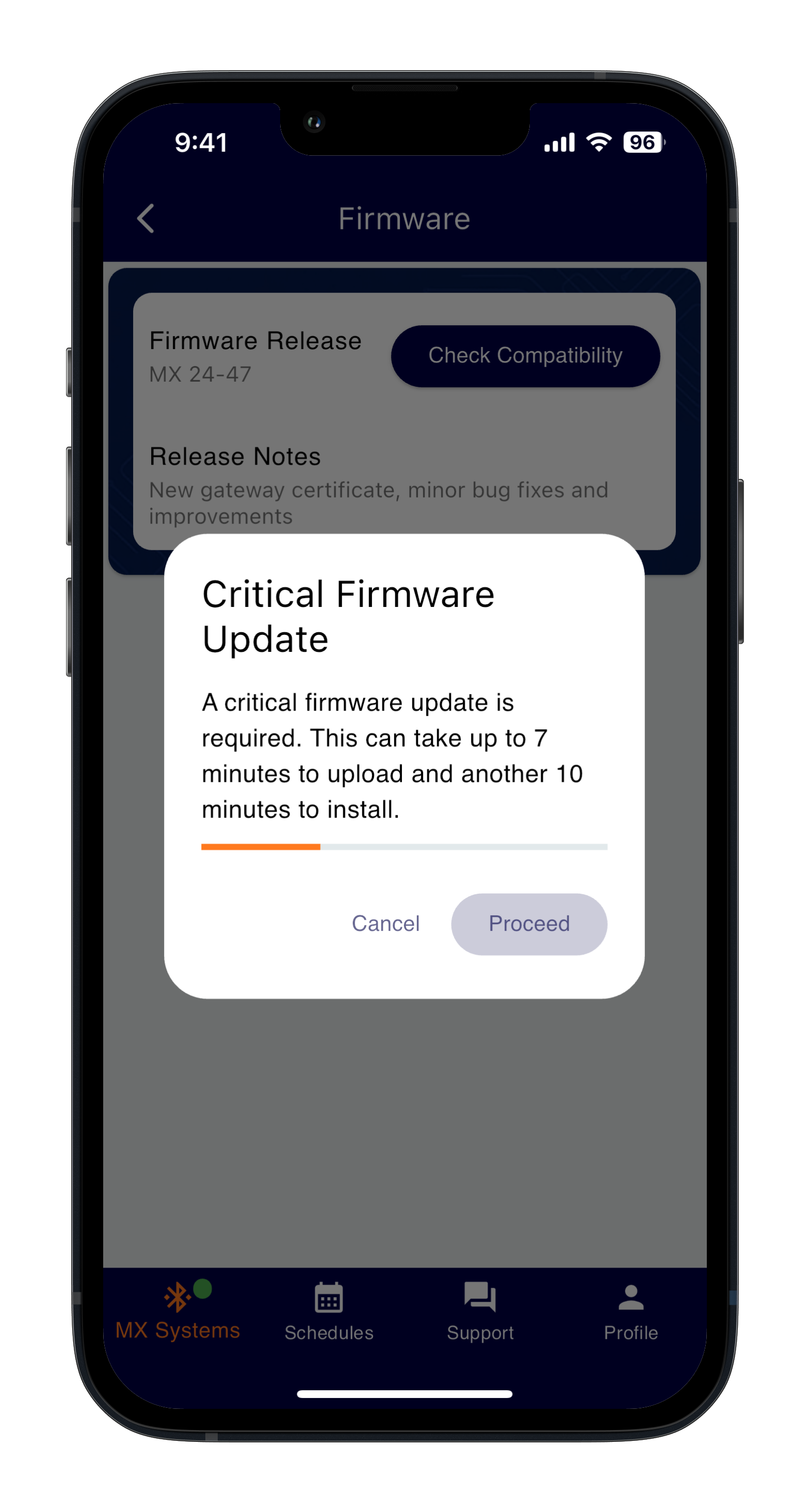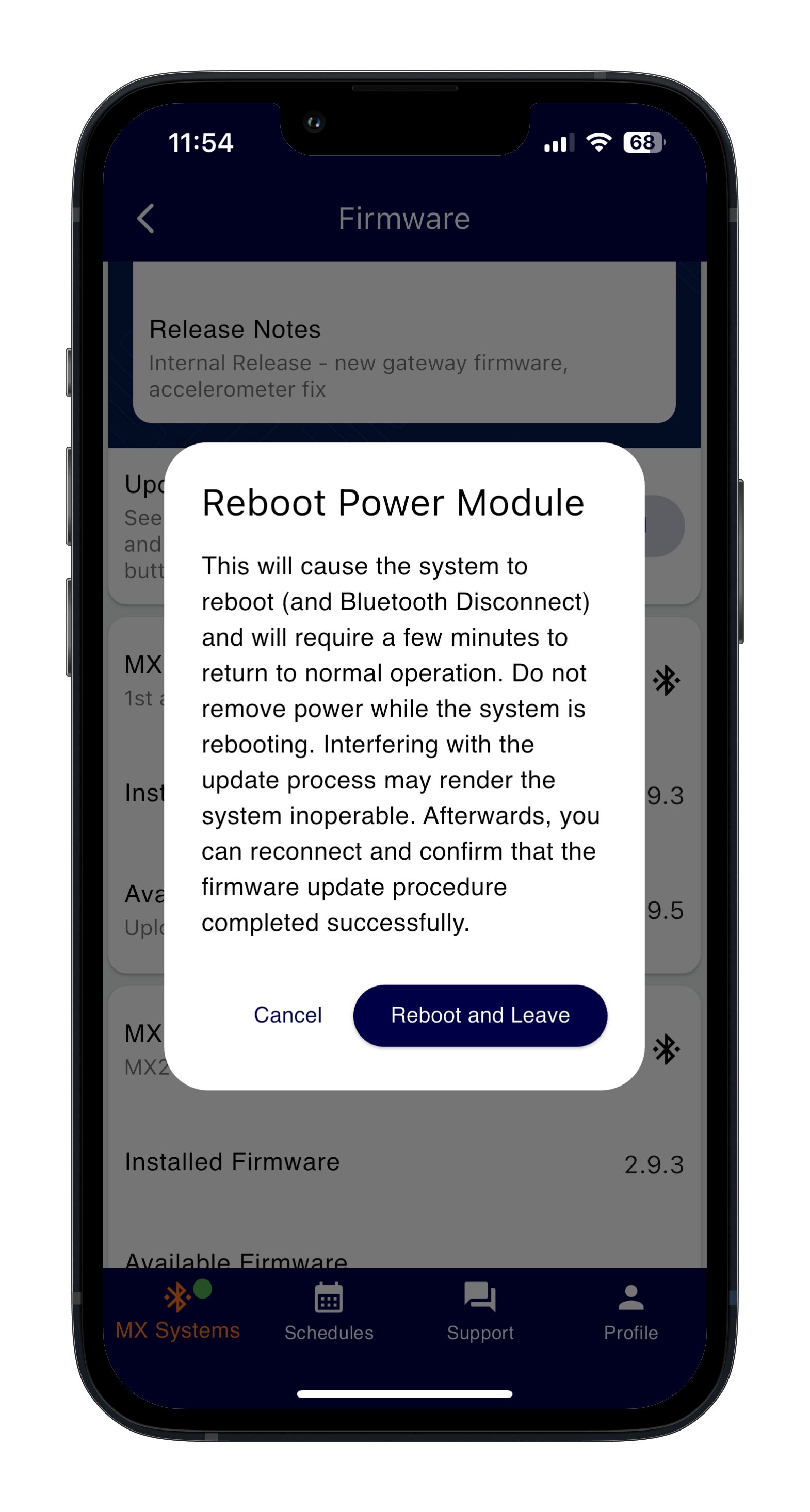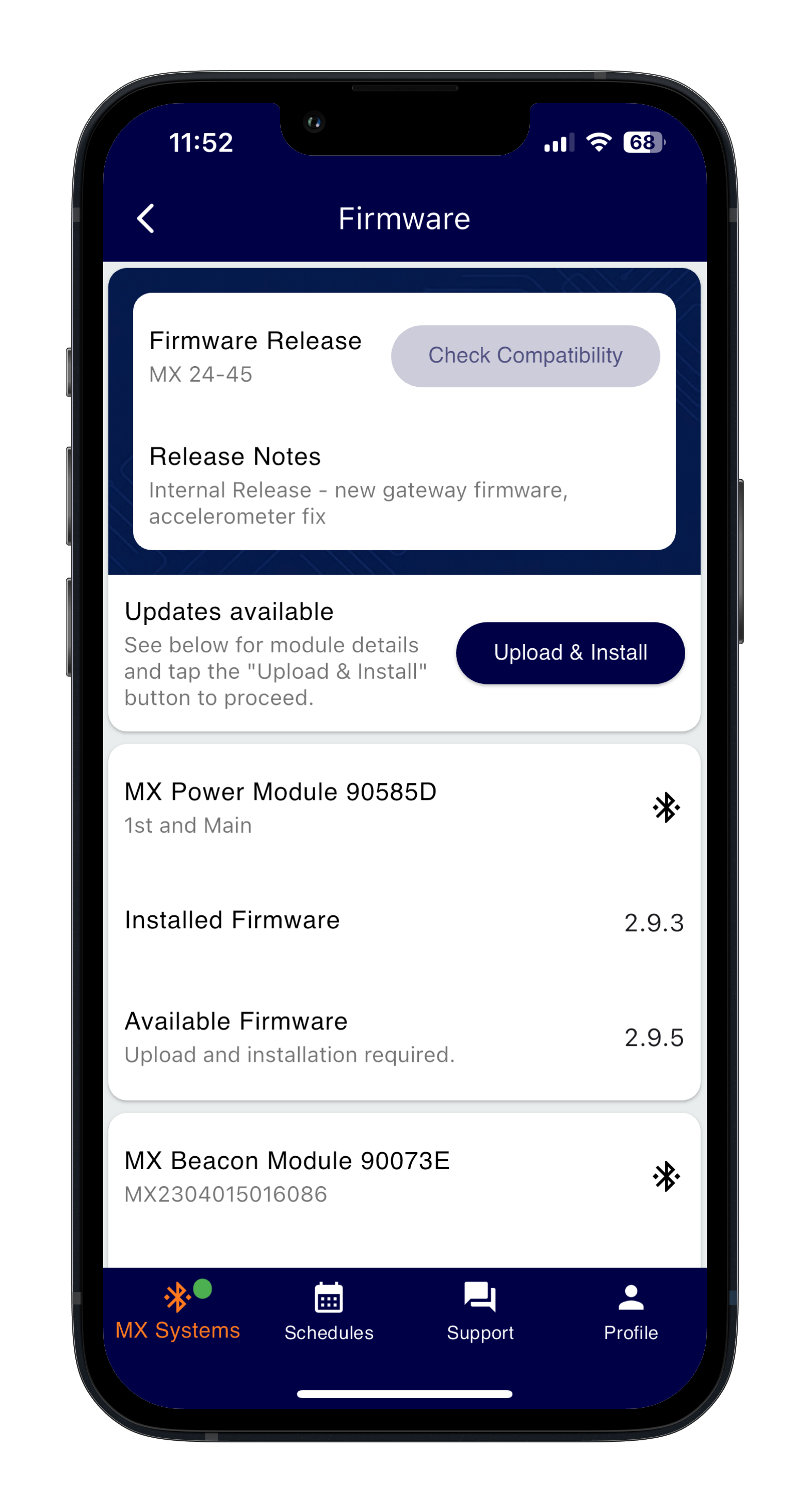 If your system has been identified as requiring this firmware update, or your system no longer reports into MX Cloud, follow the instructions below for on-site firmware updating via MX Field App: